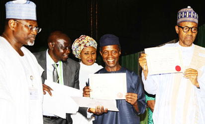 Buhari received the certificate along with his vice president-elect, Prof. Yemi Osinbajo.
