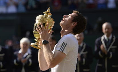 Britain’s Andy Murray holds the winner’s trophy during the presentation after beating Serbia’s Novak Djokovic in the men’s singles final on day thirteen of the 2013 Wimbledon Championships tennis tournament at the All England Club in Wimbledon, southwest London, on July 7, 2013. Murray won 6-4, 7-5, 6-4. AFP PHOTO / ADRIAN DENNIS –