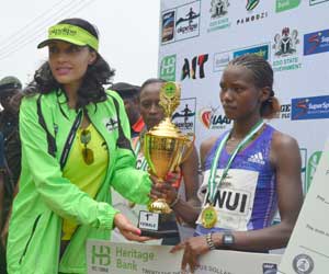 Iara in the company of her husband presented trophies and medals to winners at the Okpekpe Road Race.