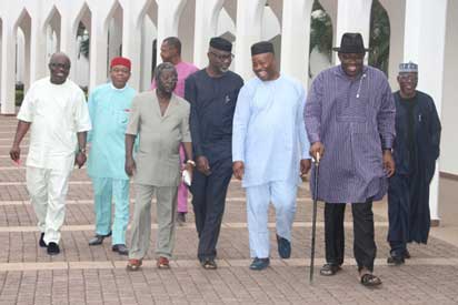 MEETING: From the left, Governor Emmanuel Uduaghan of Delta State; Governor Theodore Orji of Abia State; Governor Jonah Jang of Plateu State; Governor Sulivan Chime of Enugu State; Governor Liyel Imokeh of Cross River State; Governor Godswill Akpabio of Akwa Ibom State; Governor Seriake Dickson of Bayelsa State and the Kogi State Governor, Captain Idris Wada departing after a closed-door meeting between PDP Governors and President Goodluck Jonathan at the State House, Abuja. Photo by Abayomi Adeshida
