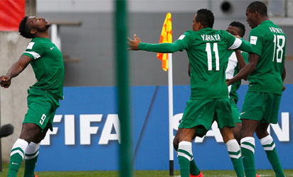 Isaac Success (L) of Nigeria celebrates after he scores his teams first goal of the game during the FIFA U-20 World Cup New Zealand 2015 Group E match between Nigeria and Brazil held at Stadium Taranaki on June 1, 20