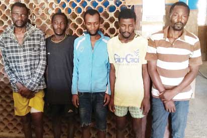 •All suspects: From left: Mukaila Dauda (herbalist), Ahmed Adebanjo, Tunde Akilo,(motorcyclist), Sunkanmi Dacosta and Lateef Agboola.