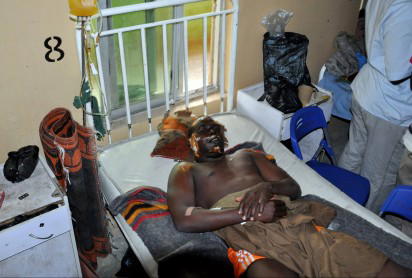 File: A man lies in state hospital bed as he receives treatment for injuries sustained following a bomb blast that left dozens dead and many injured in Maiduguri, on March 8, 2015. Three bombings in northeast Nigeria’s largest city of Maiduguri killed 58 people on March 7, 2015 and wounded 139 others, the area police chief said. Niger and Chad on March 8, 2015 launched major ground and air strikes in northeast Nigeria against Boko Haram, after the militants formally pledged allegiance to the Islamic state group in Syria and Iraq. AFP PHOTO