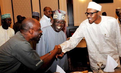 FROM LEFT: FORMER GOVERNOR OF RIVERS STATE / APC CAMPAIGN DIRECTOR-GENERAL, CHIBUIKE AMAECHI; APC LEADER, ASIWAJU BOLA TINUBU AND PRESIDENT MUHAMMADU BUHARI DURING BREAKING OF FAST AT THE PRESIDENTIAL VILLA ABUJA ON TUESDAY (14/7/15) 025/JULY2015/ICE/STATE-HOUSE