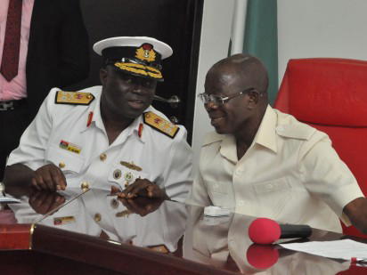 Rear Admiral Samuel Alade, Commandant, Natiional Defence College (left) and Governor Adams Oshiomhole during a visit of participants of the National Defence College, Course 24 to the Governor in his office, Friday.