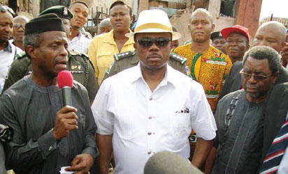 ce President, Prof. Yomi Osinbajo flanked by Gov. Willie Obiano, while addressing journalists at the scene of petroleum tanker accident, Where 69 people were killed on Sunday, at Upper Iweka, Onitsha, Thursday..
