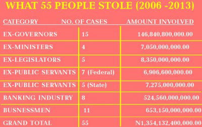 ABUJA —The Federal Government said, yesterday, that 55 well-placed Nigerians stole a whopping N1.34 trillion between 2006 and 2013, an amount that would have been enough to provide significant developmental projects across the country.