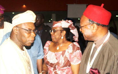 CONFERENCE—From left, Former President Olusegun Obasanjo; Ambassador Tokunboh Awolowo-Dosunmu and keynote speaker, Chief Emeka Anyaoku, during the inaugural conference of the Ibadan School of Government and Public Policy (ISGPP) held in Ibadan, yesterday: PHOTO: Dare Fasube