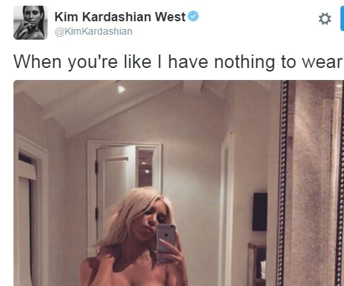 Kim who shared the nude selfie on Twitter captioned it, “When you’re like I have nothing to wear LOL.”