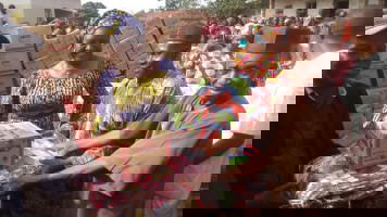 Mrs. Helen Mark, wife of Senator David Mark, presents gifts to members of Internally Displaced Persons (IDPs) camp in Agatu to celebrate the 68th birthday of the former Senate President.