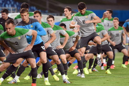 Australia’s midfielder Mile Jedinak (C-R) and his teammates go through their stretching exercises during the team’s final training run in Cuiaba, Brazil, on June 12, 2014, during the 2014 FIFA World Cup football tournament. AFP PHOTO/William WEST