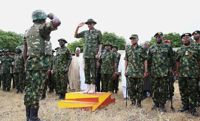President Buhari interacts with troops of HQ 1 BDE in Dansadau Zamfara State as part of the 2016 Nigerian Army Day celebration on 13th July 2016