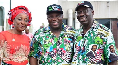 Lagos State Governor, Mr. Akinwunmi Ambode (middle), with All Progressives Congress (APC) Gubernatorial Candidate, Mr. Godwin Obaseki (right) and his Wife, Betsy during the Edo State APC Grand Finale Campaign at the Samuel Ogbemudia Stadium, Benin, on Tuesday, September 6, 2016.