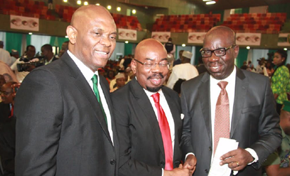 Chairman Heirs Holdings, Tony Elumelu; Chairman Zenith Bank, Jim Ovia and Edo State Governor-Elect Godwin Obaseki during the presentation of a book titled Muhammadu Buhari: The Challenges Of Leadership In Nigeria authored by Prof. John Paden at the African Hall, International Conference Centre, Abuja. Photo by Abayomi ADESHIDA 03/10/2016