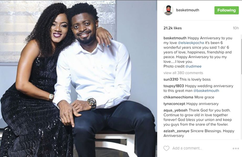 In an instagram post, Basketmouth said “Happy Anniversary to you my love @elsieokpocha, it’s been 6 wonderful years since you said ‘I do’ 6 years of love, happiness, friendship and peace. Happy Anniversary to you my love…..I love you”.