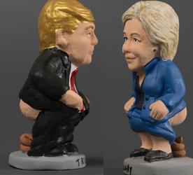 Ceramic figurines, called "caganers" (poopies), representing US Democratic presidential nominee Hillary Clinton (R) and  US Republican presidential nominee Donald Trump (L) are displayed at a factory in Torroella de montgri on November 4, 2016. Statuettes of well-known people defecating are a strong Christmas tradition in Northeastern Spanish region of Catalonia, dating back to the 18th century as Catalans hide 'caganers' in Christmas Nativity scenes and invite friends to find them. The figures symbolize fertilization, hope and prosperity for the coming year.  / AFP PHOTO