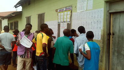 People checking for their names at polling unit 010 ward 2, Sacred Heart RC Primary School II.Akure .Photo.AKEEM SALAU