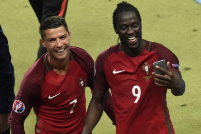 Portugal’s forward Cristiano Ronaldo (L) and Portugal’s forward Eder take a selfie as they arrive to receive their medals after the Euro 2016 final football match between Portugal and France at the Stade de France in Saint-Denis, north of Paris, on July 10, 2016. / AFP PHOTO / MIGUEL MEDINA