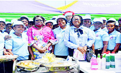 2nd from left: wife of Abia Governor, Mrs. Nkechi Ikpeazu, with a cross section of skill acquisition trainees during the launch of skill acquisition programme by her NGO Vicar Hope Foundation in Ukwa West LGA of Abia. NDE state coordinator Buchi Ojei is fourth from left}