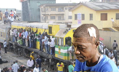 Passengers hanging on a moving train in Lagos ; (inset), a photo-journalist, Mr. Tunde Ogundeji, after he was beaten to stupor by the irate pasengers, who protested his taking their photograph at Ikeja Railway Station, Lagos, yesterday.