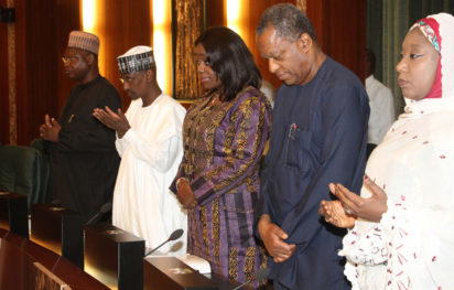 Cross section of Ministers during the opening prayers at a special session of the Federal executive Council to mark his 60th birthday for Ag. President Yemi Osinbajo at the Aso Chambers, State House, Abuja. Photo by Abayomi Adeshida 08/03/2017