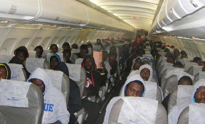 Nigerians who voluntarily returned from Libya disembarking from the aircraft on their arrival at the Murtala Muhammed International Airport, Ikeja in Lagos on Tuesday