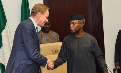 Ag. President Yemi Osinbajo receiving the President, UN Security Council, Mr. Mathew Rycroft during a meeting between the government and a delegation of the UN Security Council on the security and humanitarian situation in the Gulf of Guinea at the State House, Abuja.