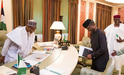 —President Muhammadu Buhari receives briefing from Vice President Yemi Osinbajo (right) after the president’s resumption at the State House, Abuja, yesterday. PHOTO: STATE HOUSE.