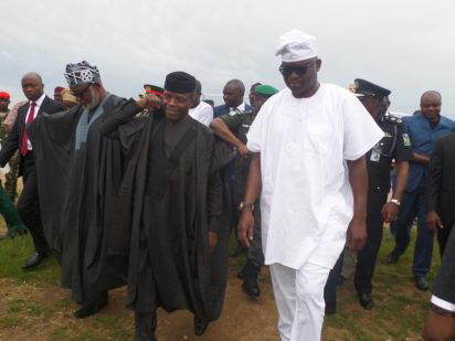 Ekiti State Governor, Mr. Ayodele Fayose, the Acting President Yemi Osinbajo and Ondo State governor Akeredolu in Iyin-Ekiti for the burial service of Late General Adeyinka Adebayo on Saturday.