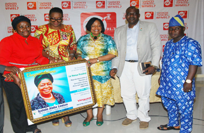 BRIEFING: From left; Mrs Sekinat Habeeb, Manager, Special Project, Vanguard Media Ltd; Mrs Toun Okewole Sonaiya, MD, WFM, 91.7 Radio Station; Iyalode Alaba Lawson, Incoming President, Nigerian Association of Chambers of Commerce, Industry, Mines and Agriculture, NACCIMA; Alhaji Wasiu Olaleye, President, Abeokuta Chambers of Commerce, Abeokuta and Abdulraham Maku, Executive Secretary, Abeokuta Chamber of Commerce during the presentation of gift to Iyalode Alaba Lawson by Vanguard Media at the press conference on the forthcoming investiture of Iyalode Alaba Lawson as President of NACCIMA held at WFM 91.7 radio station, Arepo, Ogun State yesterday. Photo by Lamidi Bamidele.