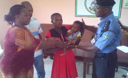Imo PPRO, Mr. Andrew Enwerem, handing over the child to the mother, Udoka Peter, at the Police Headquarters in Owerri. Photo: Chinonso Alozie.