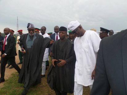 Ekiti State Governor, Mr. Ayodele Fayose, the Acting President Yemi Osinbajo and Ondo State governor Akeredolu in Iyin-Ekiti for the burial service of Late General Adeyinka Adebayo on Saturday.