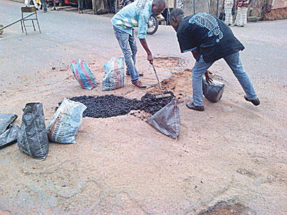 Youths filling potholes on roads.