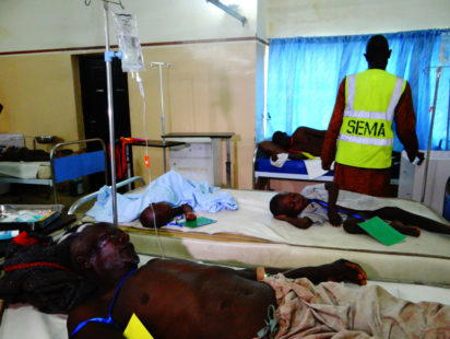 A victim is carried from the ‘accident and emergency’ at the State Specialist Hospital in Maiduguri, northeastern Nigeria on July 29, 2017 the day after two suicide bombers struck a camp for displaced people in Dikwa, 90 kilometres (56 miles) east of Maiduguri, killing five.
