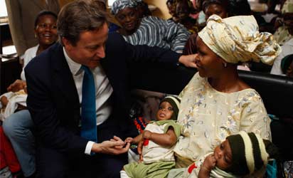 NIGERIA, Lagos : British Prime Minister David Cameron (L) chats with the mother (name unknown) of twins Mubarak and Mubarakat at a GAVI Alliance vaccine and immunization clinic in Lagos, where children are vaccinated against yellow fever under a program paid for by the British government. Cameron arrived in Nigeria on July 19, pushing a message of trade and democracy. AFP PHOTO