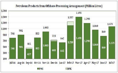 In volume terms, the report stated that a total of 1.122 billion litres of white products were distributed and sold by PPMC in the month of July 2017 compared with 1.206 billion litres in the month of June 2017, comprising 1.003 billion litres of PMS, 41.67 million litres of Kerosene and 77.24 million litres of Diesel. The report added that total revenues generated from the sales of white products for July 2016 to July 2017 stood at N1.848 trillion, where PMS contributed about 85.34 per cent of the total sales with a value of N1.577 trillion.
