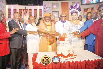 *L-R. Otunba Seni Adetu, Chief Chukwuemeka Ezeife, Olu of Warri Ikenwoli I, Pastor Ayo Oritsejafor, Pastor (Mrs) Helen Oritsejafor and other dignitaries cutting the anniversary cake.
