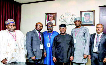 Acting President, Prof. Yemi Osinbajo,(M) with Airline CEOs; Sir Nogie Meggison, Chairman, Airline Operators of Nigeria (AON – 3rd right); Mr. Jacky Hathiramani, MD, DANA Air (2nd right); Mr. Allen Onyema, MD, Air Peace (right); Alhaji Yunusa Sarina Abdulmunaf, MD, Azman Air (left); Dr. Samson Fatokun, Area Manager, South West Africa, IATA (2nd left); and Alhaji Kashim Shettima, MD, Skyjet Aviation (3rdleft).