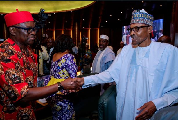 President Buhari exchanges pleasantries with the Governors of Ekiti and Lagos States ahead of the National Council of State Meeting at the State House,