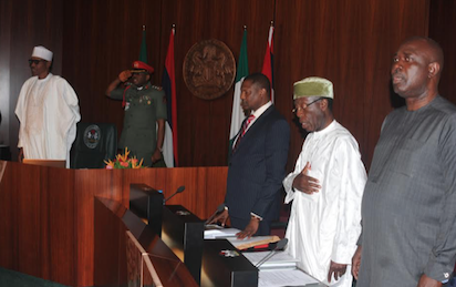 President Muhammadu Buhari; Jutice Minister, Abubakar Malami; Minister for Agriculture, Audu Ogbe and the Minister of State for Agriculture, Henekein Lokpobiri singing the national anthem at the opening of the weekly FEC Meeting at the Aso Chambers, State House, Abuja. Photo by Abayomi Adeshida 27/09/2017