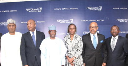 L-R- Alhaji Tijani Borodo, Shareholder, FBNQuest Merchant Bank, Mr. Kayode Akinkugbe, MD, FBNQuest Merchant Bank, Mallam Bello Maccido, Chairman, FBNQuest Merchant Bank, Dr. Omobola Johnson, Non- Executive Director FBNQuest Merchant Bank, U.K Eke (MFR), GMD FBN Holdings and Taiwo Okeowo, DMD, FBNQuest Merchant Bank at the FBNQuest Merchant Bank 3rd Annual General Meeting which held in Lagos.