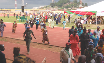 •SCAMPERING FOR SAFETY: Some APC delegates running out of the venue of the election as some hoodlums tried to hijack the election process on Saturday. Photo: Dare Fasube