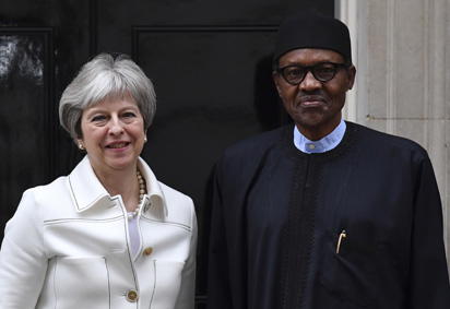 Britain’s Prime Minister Theresa May (L) poses with Nigeria’s President Muhammadu Buhari (R) on the step of 10 Downing Street in London on April 16, 2018 ahead of a meeting on the sidelines of the Commonwealth Heads of Government Meeting (CHOGM).