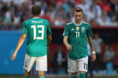 Germany’s forward Thomas Mueller (L) and Germany’s forward Marco Reus react during the Russia 2018 World Cup Group F football match between South Korea and Germany at the Kazan Arena in Kazan on June 27, 2018. / AFP PHOTO