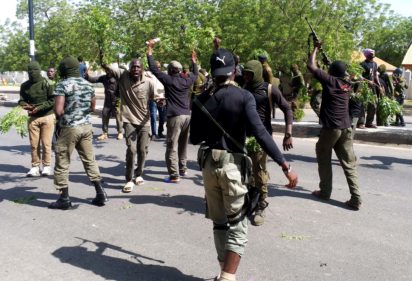 Nigerian policemen demonstrate in Maiduguri on July 2, 2018, over unpaid allowances. / AFP PHOTO / AUDU MARTE