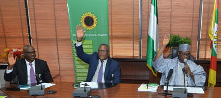 INAUGURATION: From left: NNPC GMD, Dr. Maikanti Baru (right) with some members of the newly inaugurated board of NNPC Retail Limited in Abuja today. In the middle is the Board Chairman, Engr. Saidu Mohammed, who is also NNPC Chief OperatingOfficer, Gas and Power and Managing Director of the company, Mr. Yemi Adetunji.
