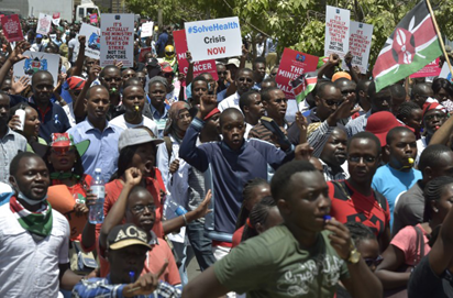 Striking doctors hold placards and chant slogans outside the Court of Appeal in Nairobi as they pushed for the release of jailed officials of the national doctors’ union as they demanded fulfilment of a 2013 agreement between their union and the government that would raise their pay and improve working conditions on February 15, 2017. / AFP PHOTO