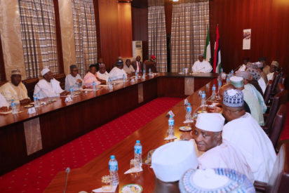 President Muhammadu Buhari meet with Chairman, All Progressive Congress (APC) Adams Oshiomhole and APC Senators at the Presidential Villa in Abuja on Wednesday