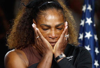 NEW YORK, NY – SEPTEMBER 08: Serena Williams of the United States reacts while being interviewed after her defeat in the Women’s Singles finals match to Naomi Osaka of Japan on Day Thirteen of the 2018 US Open at the USTA Billie Jean King National Tennis Center on September 8, 2018 in the Flushing neighborhood of the Queens borough of New York City. /Getty Images/AFP