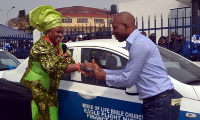 *Dr.(Mrs.) Kate Okpareke on behalf of the Word of Life Bible Church/Eagle Flight Microfinance Bank Limited presents the key of a brand new car to Oghi Peter.